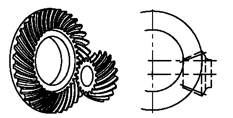 弧齒錐齒輪(圖1)是彎曲傾斜的輪齒,接觸從輪齒的一端開始平滑地向另一端延伸,與直齒錐齒輪的輪齒接觸相似,但是由于額外重疊的輪齒的作用,比直齒錐齒輪和零度錐齒輪傳動更加平穩(wěn)。尤其是在高速的情況下,降低噪音和振動非常顯著??梢詫↓X錐齒輪的輪齒進行精密加工。