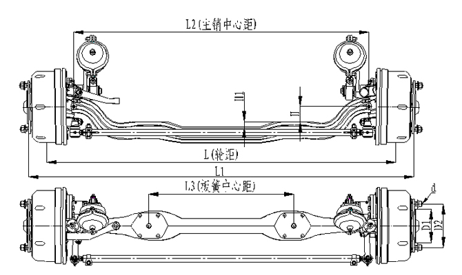 1.前軸為整體鍛造結構,采用加強設計,承載能力強; 2.輪距、板簧距可靈活調整;3.車輪輪輞定位方式可采用球面定位或止口定位
