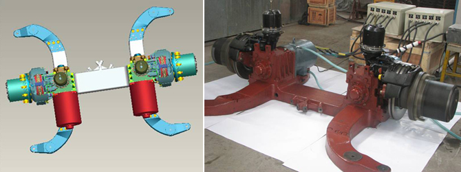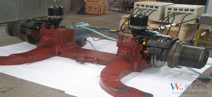 車橋型式 鑄造橋殼、氣簧懸臂、二級減速、對稱門式,精磨齒